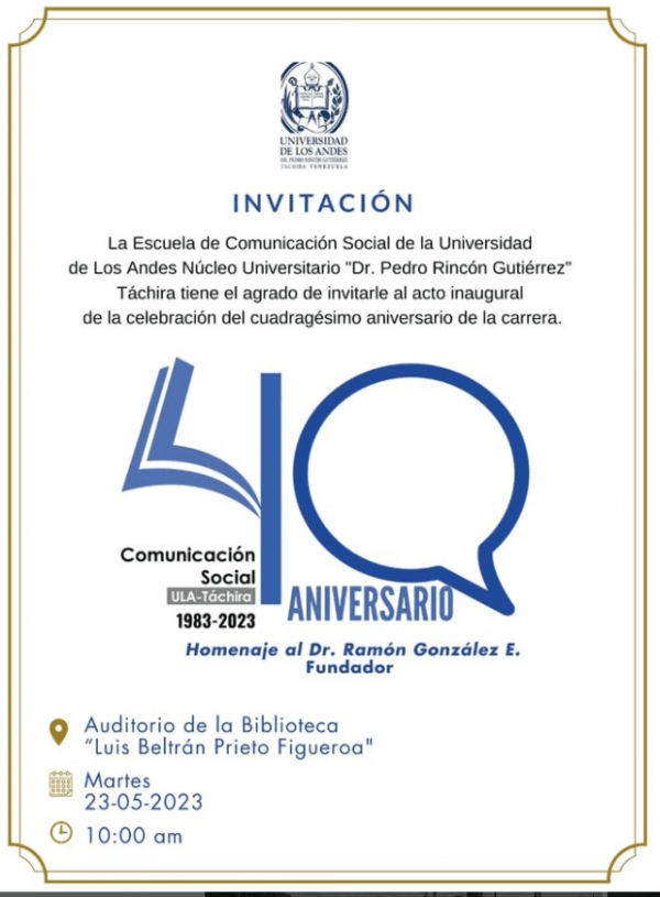 La comunidad ulandina del Táchira se viste de júbilo para celebrar los 40 años de la creación de la Licenciatura en Comunicación Social, con un acto inaugural que se realizará este martes 23 de mayo, a partir de las 10:00 a.m.