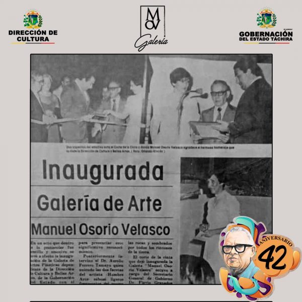 Son cuarenta dos años de existencia, a través de una emblemática reunión, el 1 de julio de 1981, que dio paso a la memorable inauguración que bautizó con el nombre completo del recordado y eterno Manuel Osorio Velasco, gracias a la iniciativa del gobernador, Dr. Ildefonso Moreno, junto a la presencia notoria de la directora de la Dirección de Cultura y Bellas Artes, Luz Vivas Terán y el titular de galería Francisco Pancho Baptista.