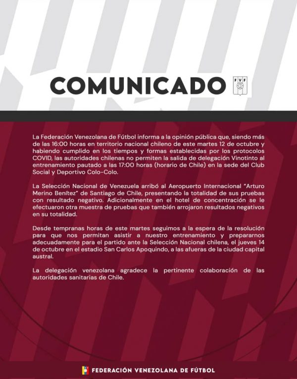 Esta situación igual a la que viven los migrantes Venezolanos en Chile, fue explicada en un cominicado dela Federación Venezolana de Fútbol en su cuenta de Twitter, @FVF_Oficial donde explican en detalles el intinerario cumplido con los protocolos de bioseguridad y pruebas PCR, en el aeropuerto Merino Benítez, de Santiago de Chile, todas con resultado negativo. El juego del día jueves 14 entre Venezuela contra los chilenos será en el estadio San Carlos de Apoquindo, a las afueras de Santiago, capital del país austral.