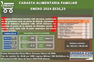 El Centro de Documentación y Análisis Social de la Federación Venezolana de Maestros (Cendas-FVM), informó que la Canasta Alimentaria Familiar de enero de 2024 se situó en 535,23 dólares.
