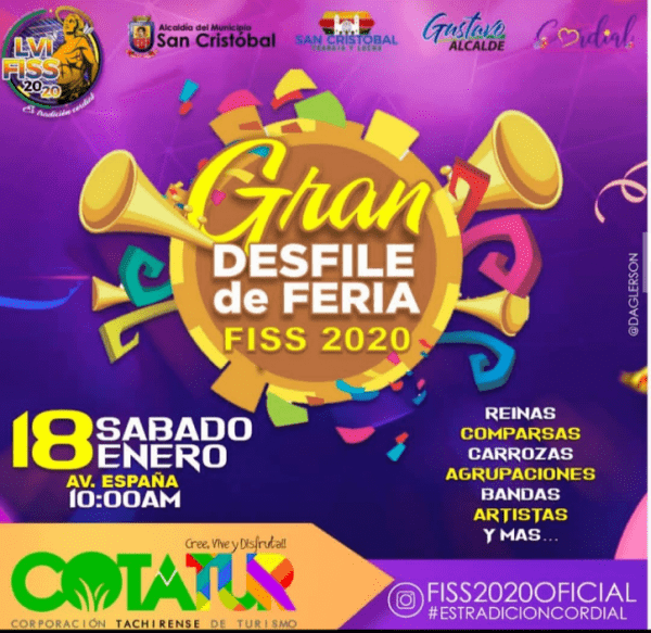 Este sábado 18 de Enero será el Gran Desfile de la Feria Internacional de San Sebastián 2020, donde los asistentes podrán disfrutar de vehículos clásicos, de la presentación de la escuela de equitación del estado, EQUITACHIRA, bandas, compartas y más de 20 carrozas.