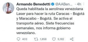 En un mensaje en su cuenta Twitter, Benedetti especificó que Laser tendrá las rutas Caracas – Bogotá y Maracaibo – Bogotá.