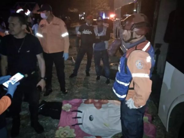 En el sitio del acotencimiento el conductor del buscama, se encontraba realizando el cambio de neumático debajo del bus y el sistema de elevación hidráulica falló, quedando presionado, producto del impacto el conductor falleció.