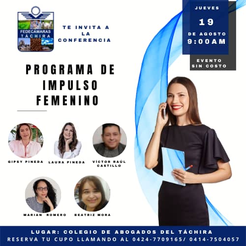 Este jueves 19 de agosto a partir de las 9 am, en las instalaciones del Colegio de Abogados del Táchira, se realizará el lanzamiento del Programa de Impulso Femenino (PIF) de Fedecámaras Táchira.