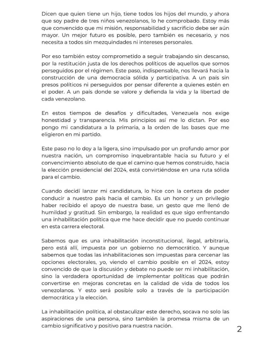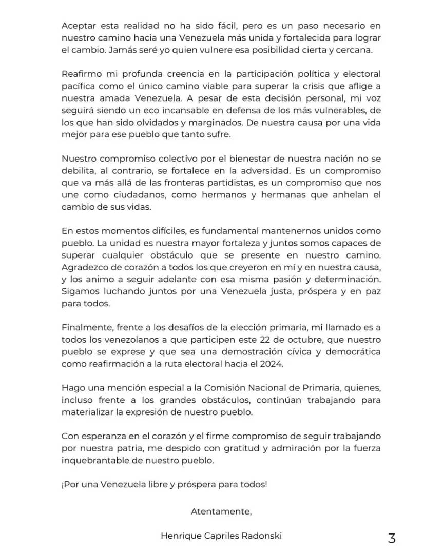 Este domingo el precandidato Henrique Capriles Radonski anunció en medios de difusión masivos que se retira su candidatura de la Elección Primaria, pautado para el 22 de octubre.