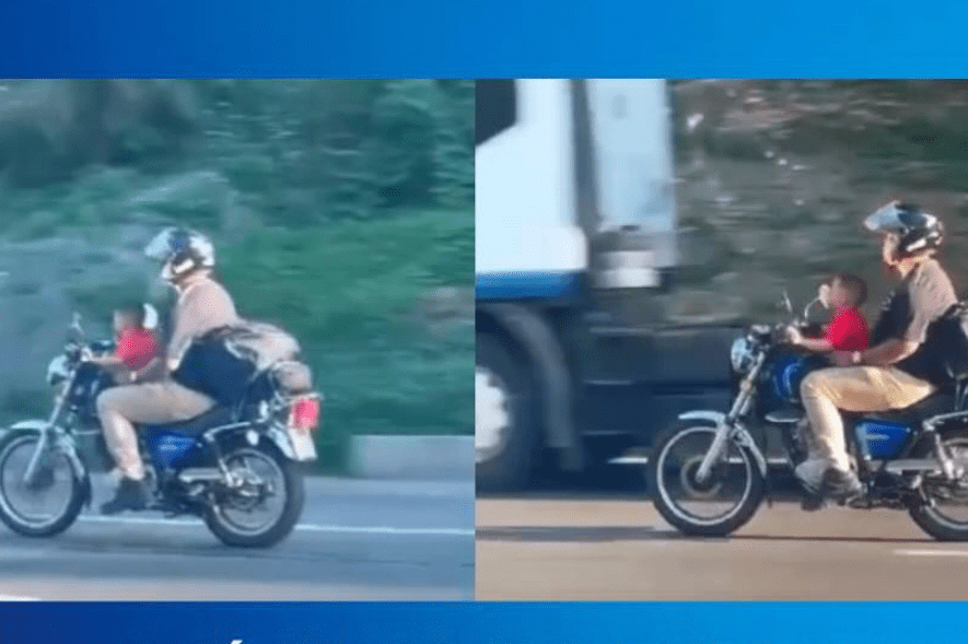 En un material audiovisual se observa a un hombre a bordo de un vehículo tipo moto, sin utilizar casco de seguridad, quien de manera imprudente somete a un niño a conducir por una autopista de gran circulación en el país, colocando en riesgo su vida. Via @mpublicove