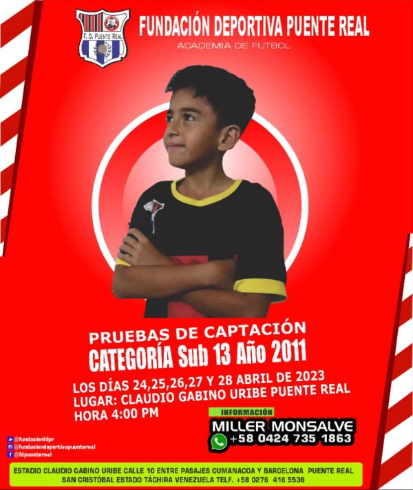 Invitaron los coordinadores deportivos de la Fundación Deportiva Puente Real a los padres y representantes que deseen formar a sus hijos y representados en el maravilloso mundo del fútbol a acudir los días 26, 27 y 28 de abril a partir de la 4:00 de la tarde al Campo Claudio Gabino Uribe de Puente Real.