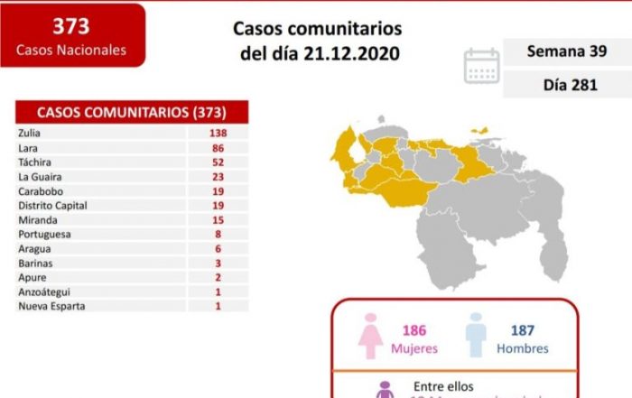 Un total de 373 nuevos casos de transmisión comunitaria y 65 importados de COVID-19, fueron detectados en las últimas 24 horas por las autoridades sanitarias venezolanas, para elevar la cifra [...]