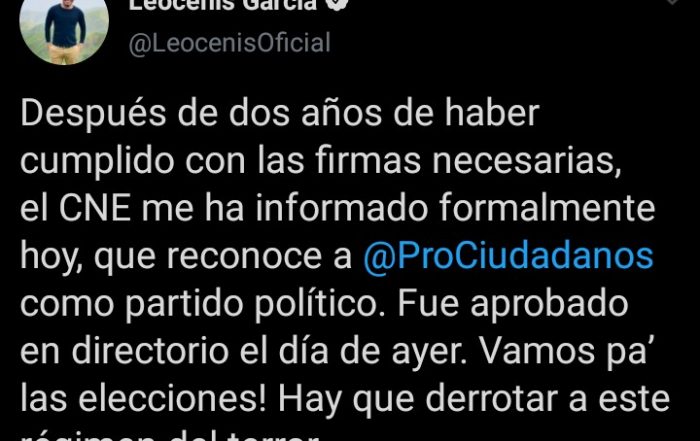 CNE legaliza el partido Prociudadanos de Leocenis García El dirigente político y coordinador del partido ProCiudadanos, Leocenis García dio a conocer este viernes mediante su [...]
