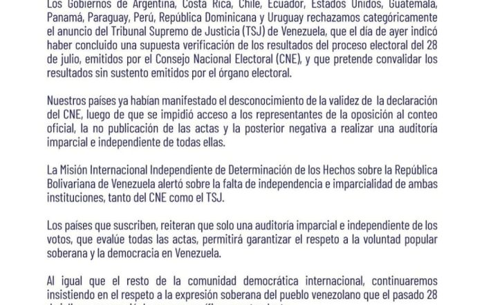 Comunicado de 11 países que rechazan la sentencia del Tribunal Supremo de Justicia (TSJ) de Venezuela Los gobiernos de Argentina, Costa Rica, Chile, Ecuador, Estados Unidos, Guatemala, Panamá, Paraguay, Perú, [...]