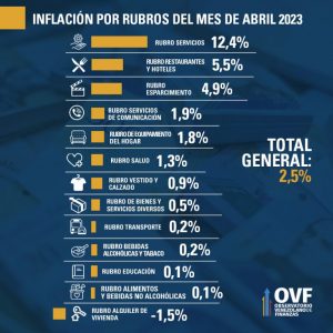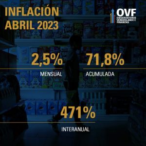 Las cifras de inflación estimadas por el OVF correspondientes a abril de 2023 indican que el ritmo de aumento de los precios se desaceleró significativamente al alcanzar la inflación mensual 2,5% y la anualizada 471%, ambas inferiores a las del mes de marzo.